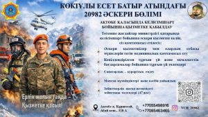 Қазақстан Республикасы Төтенше жағдайлар министрлігінің Есет батыр Көкіұлы атындағы 20982 әскери бөлімі Қазақстан Республикасының азаматтарын келісімшарт бойынша әскери қызметке шақырады.