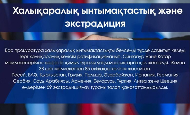 Бас прокуратура халықаралық ынтымақтастықты белсенді түрде дамытып келеді. Төрт халықаралық келісім ратификацияланып, Сингапур және Катар мемлекеттерімен өзара іс-қимыл туралы уағдаластықтарға қол жеткізілді. Жалпы 38 шет мемлекетпен 85 екіжақты келісім жасалған.